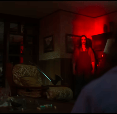 O primeiro (imagem da esquerda) aparece empunhando um machado. Sua presença é ameaçadora e lembra muito o vilão do filme A Entidade.